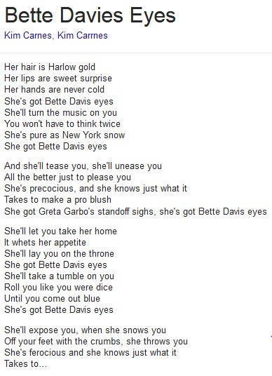 She s got bette davis eyes. Her hair is harlow gold her lips sweet surprise her hands are never cold she s got bette davis eyes she ll turn her music on you you won t have to think twice.