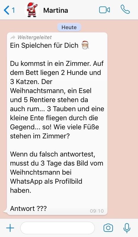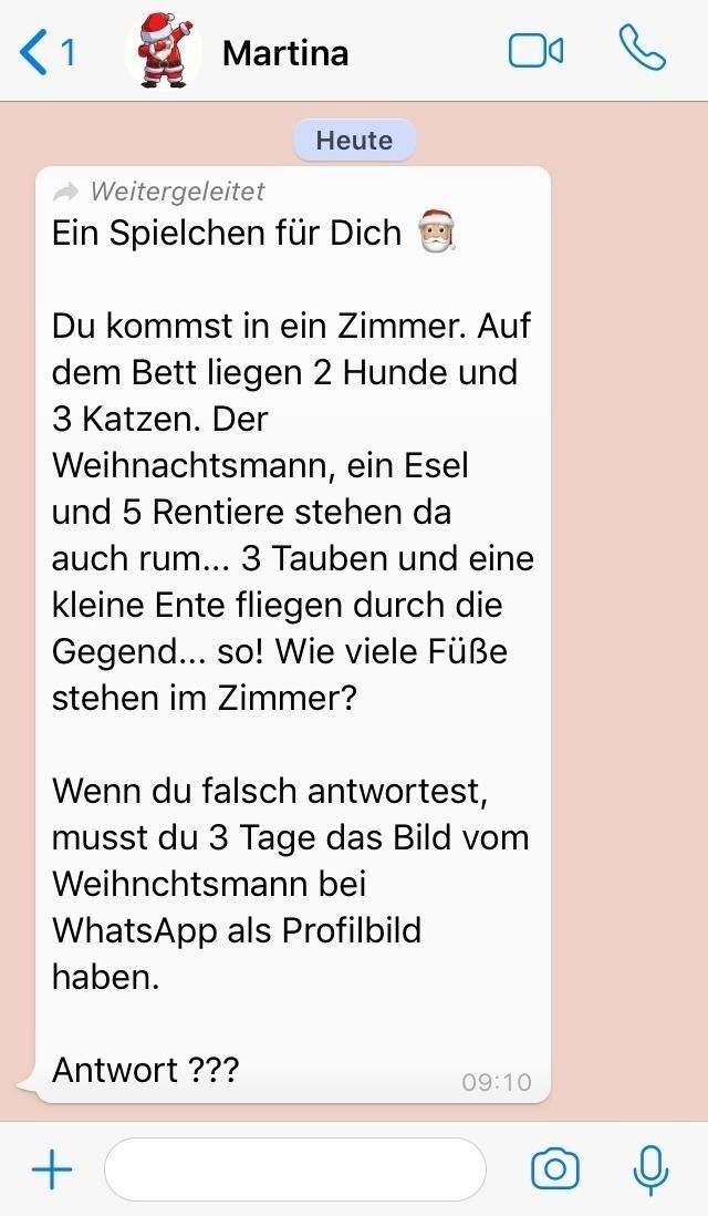 Wie viele füße stehen im zimmer. Der weihnachtsmann ein esel und 5 rentiere stehen da auch rum 3 tauben und eine kleine ente fliegen durch die gegend so. Wenn du falsch antwortest musst du 3 tage lang das bild der giraffe bei whatsapp als profilbild haben.