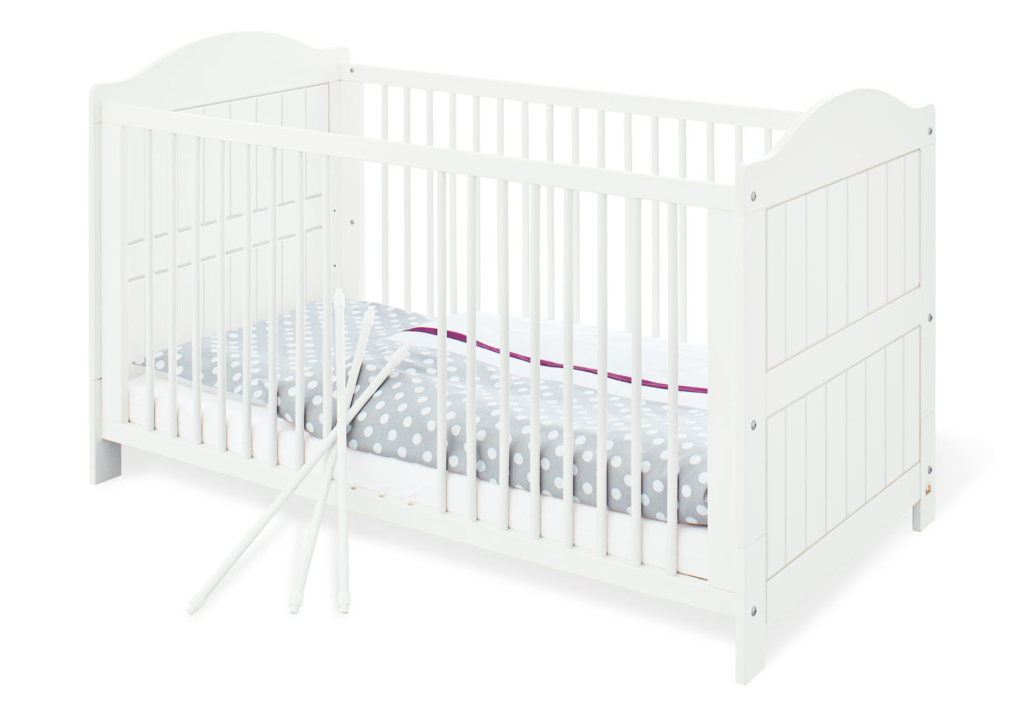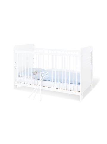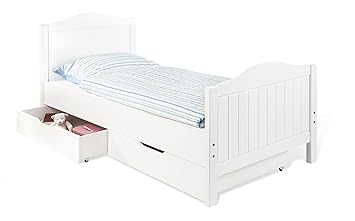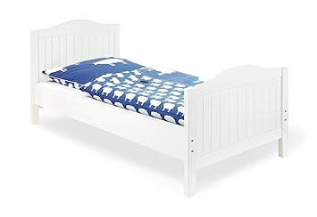 Umbau zum juniorbett conversion into junior bed transformation en lit junior transformación en cama júnior conversione in letto junior omzetting in junior bed. Stabiles umbaubares massivholzbett mit 3 fach höhenverstellbarem lattenrost aus vollmassiver kiefer weiß lasiert. Pinolino kinderträume kinder bett nina.